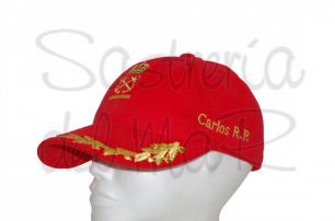 Gorra sport roja con laureles bordados en la visera, medida ajustable , con el escudo de Patrón de Embarcaciones de Recreo (PER) bordado en el frontal y personalizada con su nombre , el de su barco o la bandera que elija