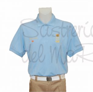 Polo de alta calidad color celeste con el escudo de Patrón de Yate bordado en el pecho y personalizado con su nombre , el de su barco y la bandera española o la que elija